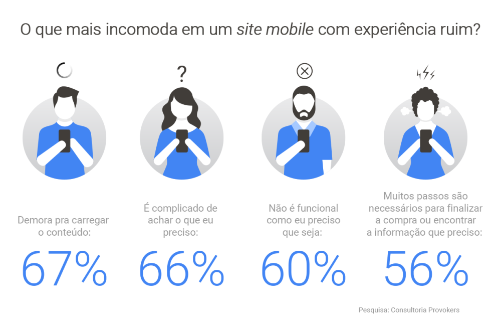 E as questões que mais incomodam aos usuários quando não têm uma boa experiência são: tempo de carregamento, funcionalidades limitadas e navegação complicada ou pouco intuitiva.